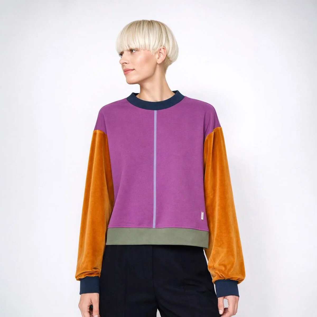 Very Berry bringt sofort Energie in den Raum. Das intensive Beerenviolett wirkt lebendig und mutig, während die warmen orangefarbenen Ärmel einen starken Kontrast setzen. Zusammen entsteht eine Farbkombination, die gleichzeitig verspielt und kraftvoll wirkt – auffällig, aber klar.