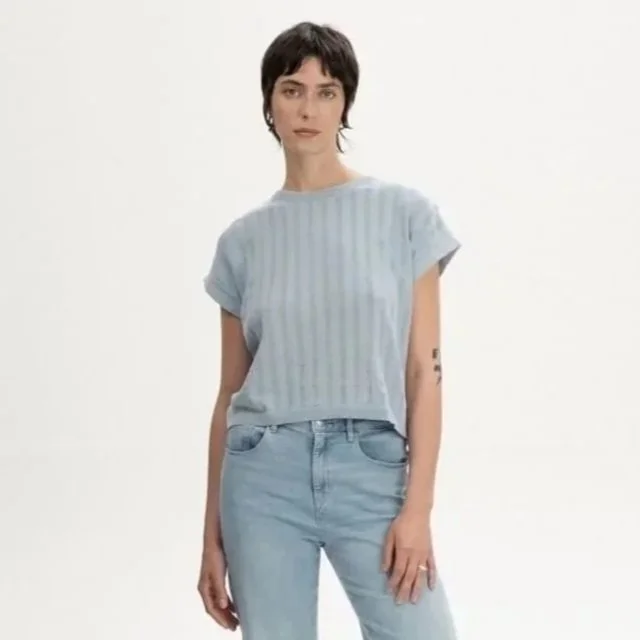 Die lockere Passform mit Rundhalsausschnitt sorgt für eine entspannte Silhouette. Die vertikale Strickstruktur gibt dem Shirt zusätzliche Tiefe und verleiht dem Material eine ruhige, hochwertige Oberfläche.