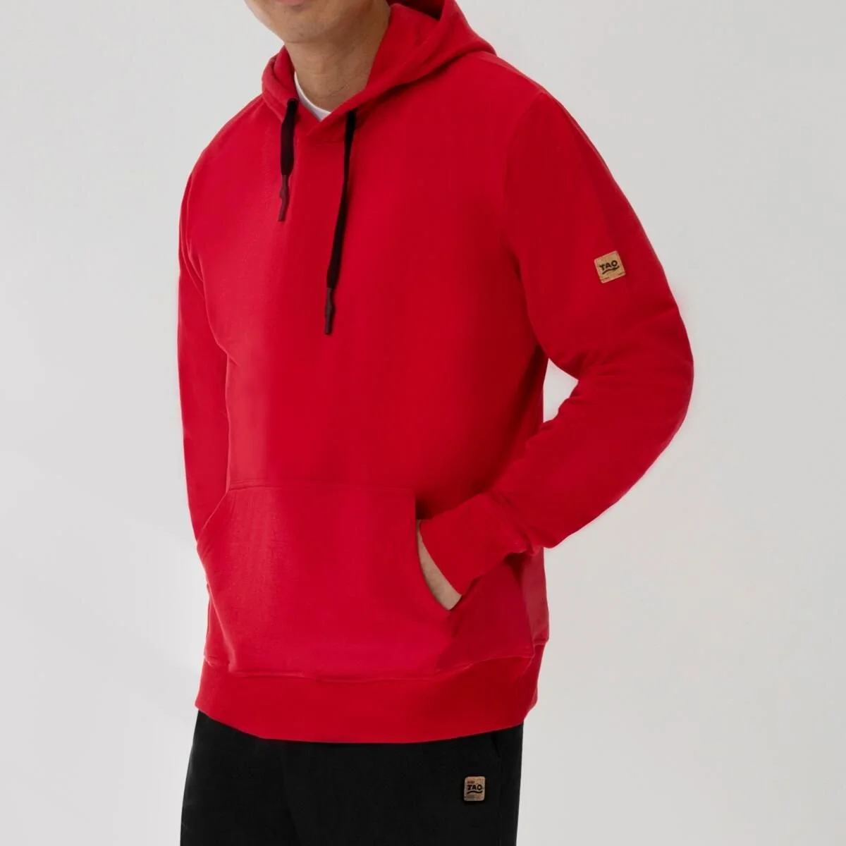 Der Stoff fühlt sich weich und stabil an. Die Oberfläche ist glatt, innen leicht angeraut – dadurch entsteht ein angenehmes, warmes Tragegefühl, ohne schwer zu wirken. Ein unkomplizierter Hoodie für Alltag, Bewegung und kühlere Tage.