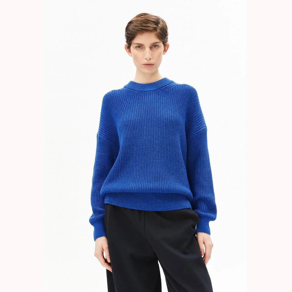 Der strukturierte Baumwollstrick fällt weich im Loose Fit. Die entspannte, leicht oversized Silhouette sorgt für eine klare, moderne Form und verbindet Komfort mit selbstbewusster Ausstrahlung – für Menschen, die Haltung durch Farbe und Form sichtbar machen.